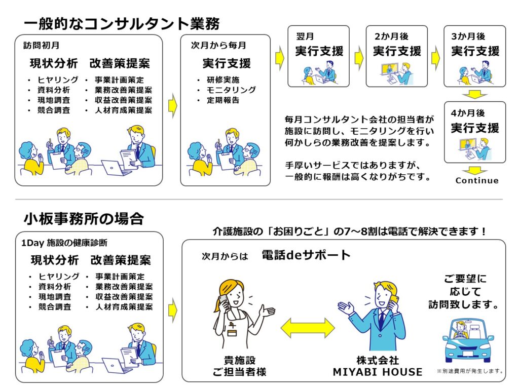 弊社のコンサルタントが現地へ赴き、健康診断と同じように施設の経営状態を1日かけて検査し、